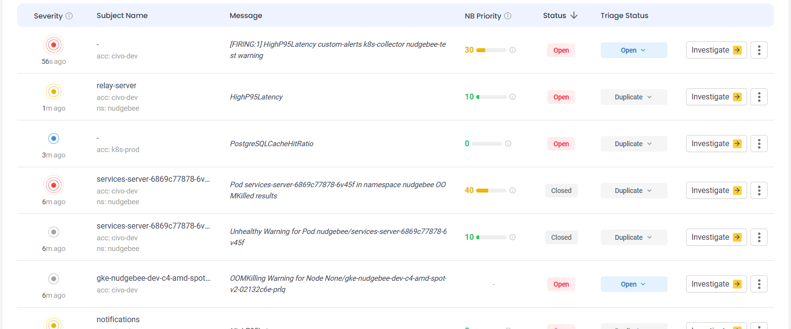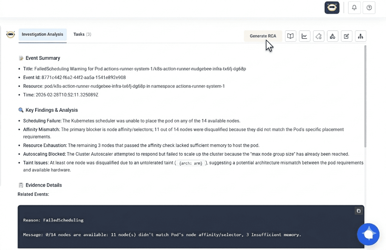 NudgeBee's AI-SRE Assistant automatically triages alerts, identifies root causes, and drives remediation so your team spends less time firefighting and more time building.
