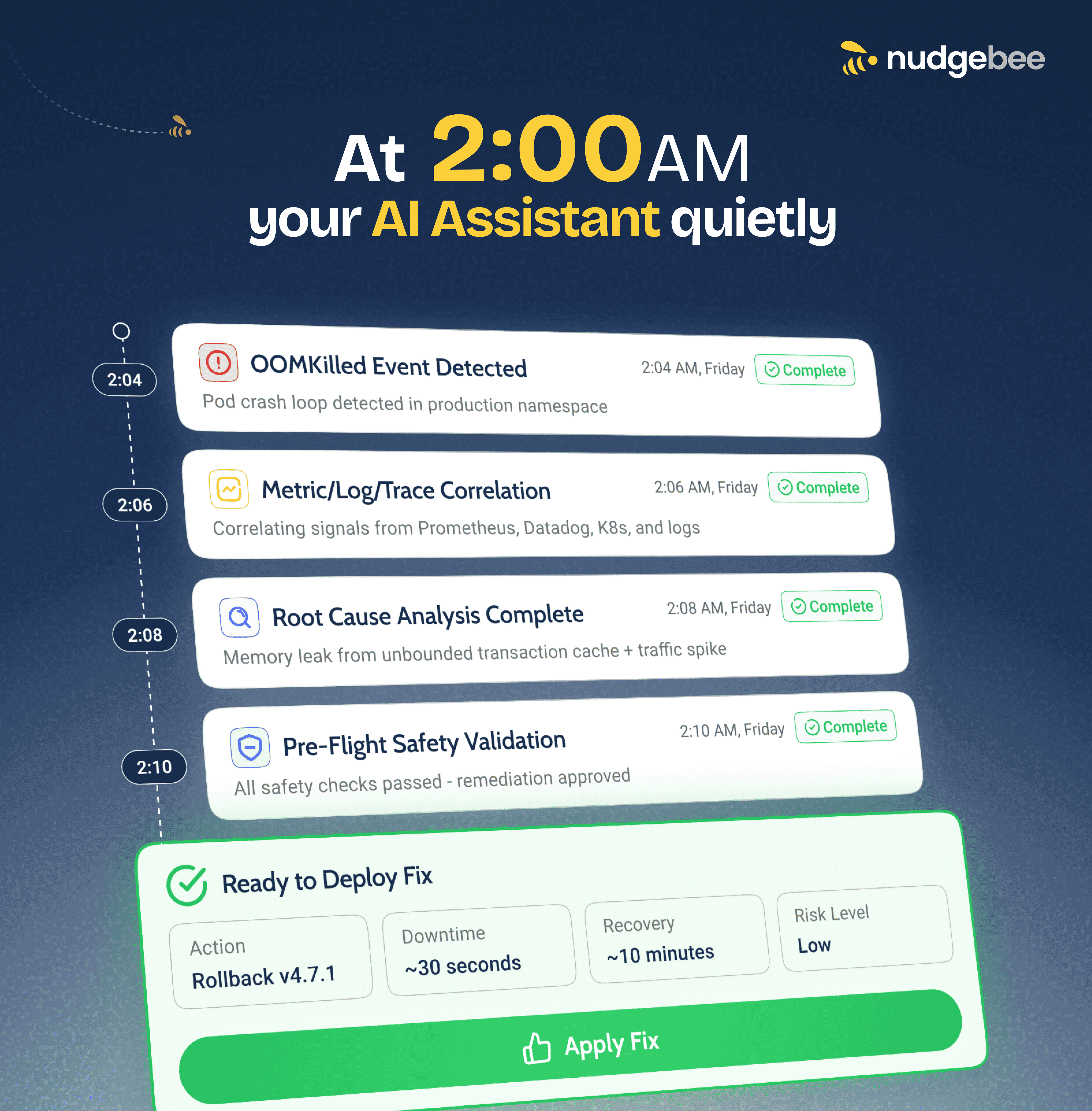 Nudgebee provides pre-built AI assistants designed to augment your team's capabilities. These specialized agents come with guardrails and human-in-the-loop controls for safe, reliable automation.